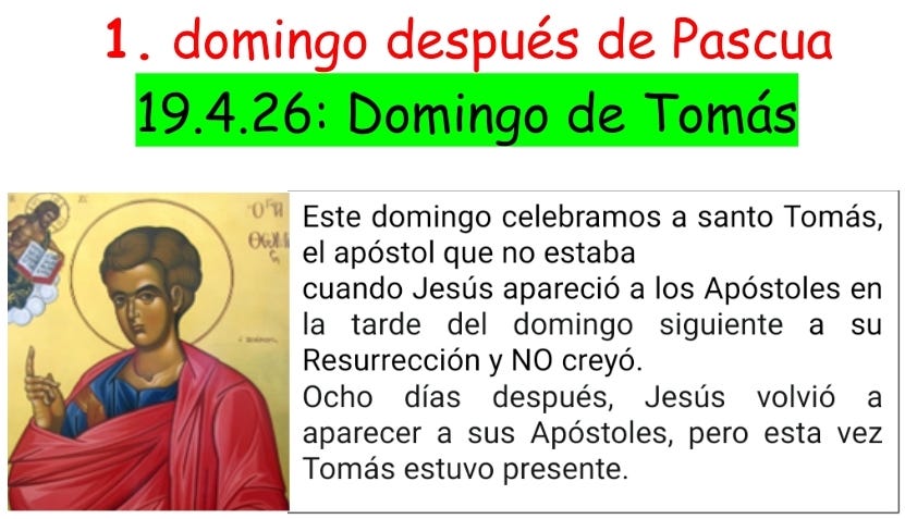 El primer domingo de Pascua ES el domingo de la Resurrección; como consecuencia, el segundo domingo de Pascua, sería el primer domingo después de Pascua y así seguiremos con nuestro “camino hacia Pentecostés”.