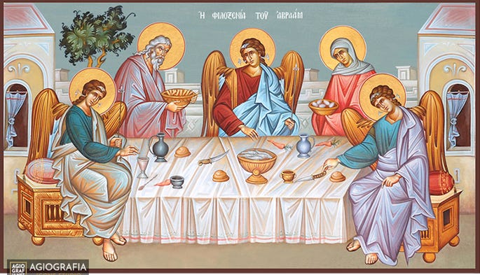 Los primeros iconos se ocupaban más de "la hospitalidad de Abraham", mientras que Rublev hace hincapié en "la Santísima Trinidad".