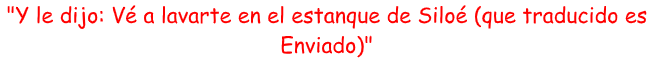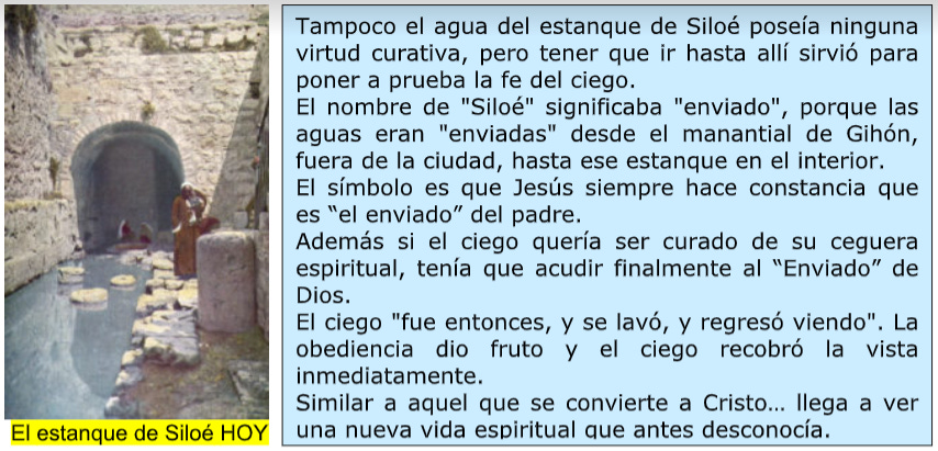 Aquel hombre había recibido la vista física, pero evidentemente, todavía no a Jesús. En el resto del capítulo se ve el progreso espiritual de aquel hombre en su camino de fe, hasta su comprensión plena de quién era Jesús. En un primer momento el ciego encuentra a Jesús como un «hombre» entre los demás; luego lo considera un «profeta»; y, al final, sus ojos se abren y lo proclama «Señor».