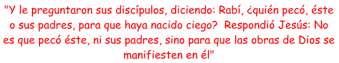 Los apóstoles no rogaron a Jesús que le sanara, sino que le hicieron una pregunta teológica. Este hombre llega ciego a este mundo, porque tiene que encontrarse con el Mesías, el Hijo de Dios, para mostrar que Jesús realmente era el Salvador; esta alma nació para la gloria de Dios.