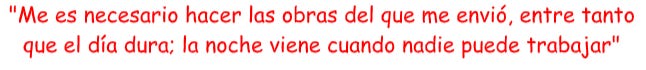 Nosotros también debemos seguir su ejemplo y asegurarnos de utilizar bien nuestra vida para la gloria de Dios en tanto que "el día dura". La noche se acerca y jamás podremos recuperar las oportunidades perdidas.