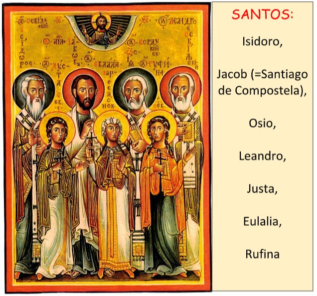 San Osio de Córdoba, san Leandro y san Isidoro de Sevilla, san Hermenegildo de Tarragona, san Fulgencio y santa Florentina de Cartagena, san Eugenio de Toledo, santa Eulalia de Barcelona, san Fructuoso de Tarragona, san Ildefonso de Toledo, santa Julia de Mérida, santas Justa y Rufina de Sevilla, santa Laura de Córdoba, San Vicente de Huesca, santos Ciriaco y Paula de Málaga, santas Polixenia y Xantipa de Alicante, san Eulogio de Córdoba y muchísimos más.