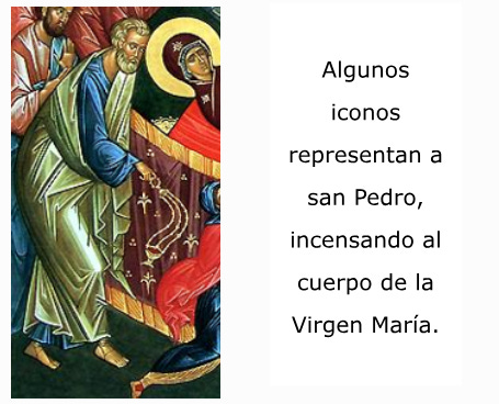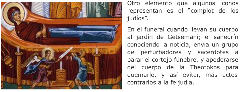 Ciertos iconos, mayormente los rusos, representan a la Virgen elevada al cielo por ángeles.