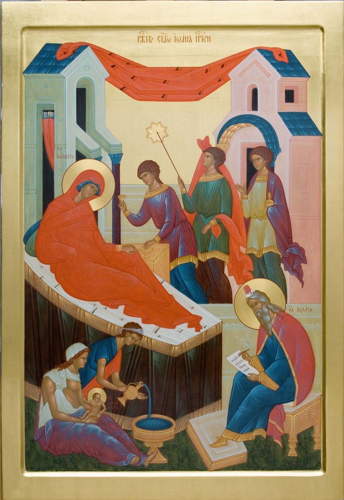 Llegó el momento, y Santa Isabel dio a luz un hijo, y todos los parientes y conocidos se alegraron junto con ella. Al octavo día, conforme a la ley de Moisés, se hizo la circuncisión. Su madre le puso por nombre Juan. Todos se asombraron, pues nadie en su familia había recibido tal nombre. Cuando le preguntaron a san Zacarías, éste hizo ademán de coger una tablilla y escribir en ella "Juan es su nombre", e inmediatamente se le desató la traba de la lengua por la predicción del arcángel, y San Zacarías, impulsado por el Espíritu Santo, glorificó a Dios y pronunció las palabras proféticas sobre la venida al mundo del Mesías y sobre su propio hijo Juan, el Precursor del Señor.