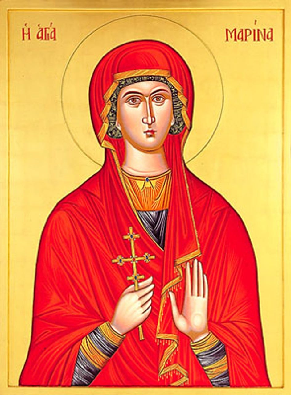 La Santa Gran Mártir Marina nació en Asia Menor, en la ciudad de Antioquía, en el seno de la familia de un sacerdote pagano. En la infancia perdió a su madre, y su padre la entregó al cuidado de una niñera, que educó a Marina en la fe ortodoxa. Al enterarse de que su hija se había convertido al cristianismo, el padre la repudió airadamente. En la época de la persecución contra los cristianos bajo el emperador Diocleciano (284-305), Santa Marina, a los quince años de edad, fue arrestada y encerrada en prisión. Con firme confianza en la voluntad de Dios y en su ayuda, la joven prisionera se preparó para su inminente destino. El gobernador Olibrio, encantado con la bella muchacha, intentó persuadirla para que renunciara a la fe cristiana y se convirtiera en su esposa. Pero la santa, firme, rechazó sus falsas ofertas. El gobernador, irritado, sometió a tortura a la santa mártir. Después de golpearla ferozmente, la ataron con clavos a una tabla y desgarraron su cuerpo con tridentes. El propio gobernador, incapaz de soportar el horror de estas torturas, ocultó su rostro entre las manos. Pero la santa mártir permaneció inquebrantable. Arrojada por la noche a la cárcel, recibió ayuda celestial y fue curada de sus heridas. Atada a un árbol, la abrasaron con fuego. Apenas con vida, la mártir rezó: «Señor, me has concedido atravesar el fuego por tu Nombre, concédeme también atravesar el agua del santo Bautismo...».