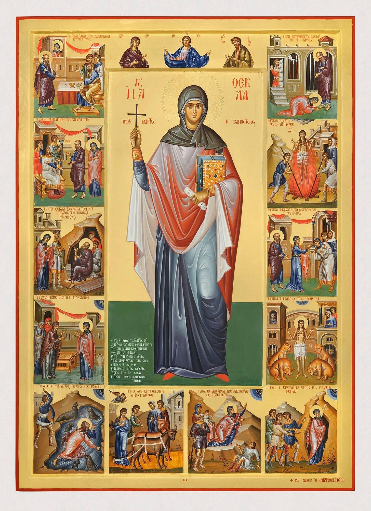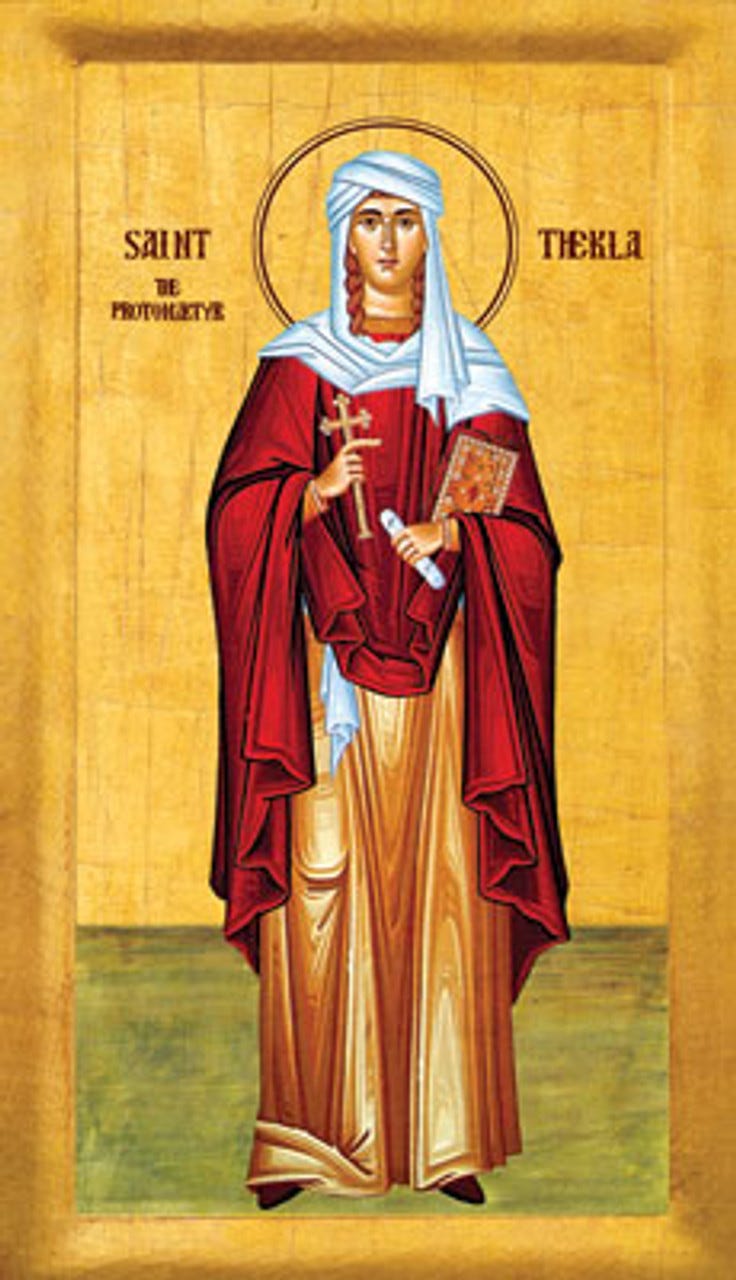 La Santa Primera Mártir e Igual a los Apóstoles Tecla nació en la ciudad de Iconio. Era hija de padres ricos e ilustres, y además se distinguía por una belleza extraordinaria. A los 18 años la comprometieron con un joven distinguido. Pero al oír la predicación del santo Apóstol Pablo sobre el Salvador, Santa Tecla amó de todo corazón al Señor Jesucristo y resolvió firmemente no contraer matrimonio, sino dedicar toda su vida a la predicación del Evangelio. La madre de Santa Tecla se opuso a los planes de su hija y le exigió que se casara con el novio que le había prometido. Su prometido, por su parte, denunció al apóstol Pablo ante el gobernador de la ciudad, acusándole de haber puesto a su novia en su contra. El gobernador encarceló a San Pablo. Durante la noche, Santa Tecla huyó en secreto de su casa y sobornó a los guardias de la prisión, dándoles todos sus adornos de oro. Durante tres días permaneció sentada a los pies del apóstol Pablo, escuchando sus paternales preceptos. Se descubrió la desaparición de Tecla y se enviaron criados a todas partes en su busca. Finalmente la encontraron en la prisión y la llevaron a casa por la fuerza.