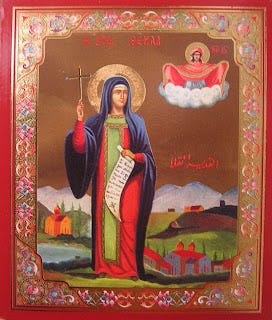 Enseñada por las palabras de Pablo, oh Tecla, esposa de Dios, y confirmada por la fe por Pedro, oh divinamente llamada, te mostraste como la protomártir y primera sufriente entre las mujeres. Entraste en la llama como en un lugar rebosante de flores, y las fieras y los toros te temían, porque te armaste con la Cruz. Por eso, oh alabadísima, ruega a Cristo que salve nuestras almas.