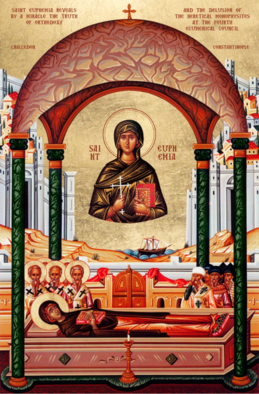 Más tarde se erigió una majestuosa iglesia sobre la tumba de la Gran Mártir Eufemia. En este templo tuvieron lugar las sesiones del Cuarto Concilio Ecuménico en el año 451, durante el cual, de manera milagrosa, la santa Gran Mártir Eufemia confirmó la confesión ortodoxa y puso límites a la herejía monofisita (es una doctrina que niega que en Jesucristo haya dos naturalezas. Se identifica generalmente como eutiquianismo, nombre dado a la doctrina de Eutiques, que no admitía sino una sola naturaleza en Jesucristo).