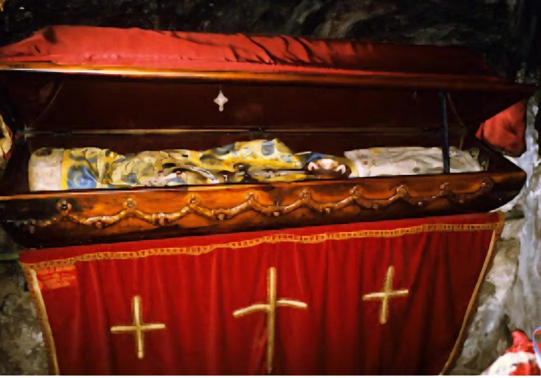 Ante ellos apareció el santo en un cuerpo glorificado del color de la cera pura, que despedía una fragancia similar a la de las hojas de albahaca. Entonces los monjes colocaron su cuerpo incorrupto en una urna y lo llevaron al Monasterio Superior, a la iglesia de la Presentación de la Santísima Theotokos, donde reposa hasta el día de hoy.