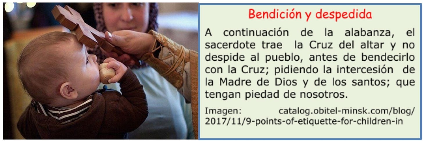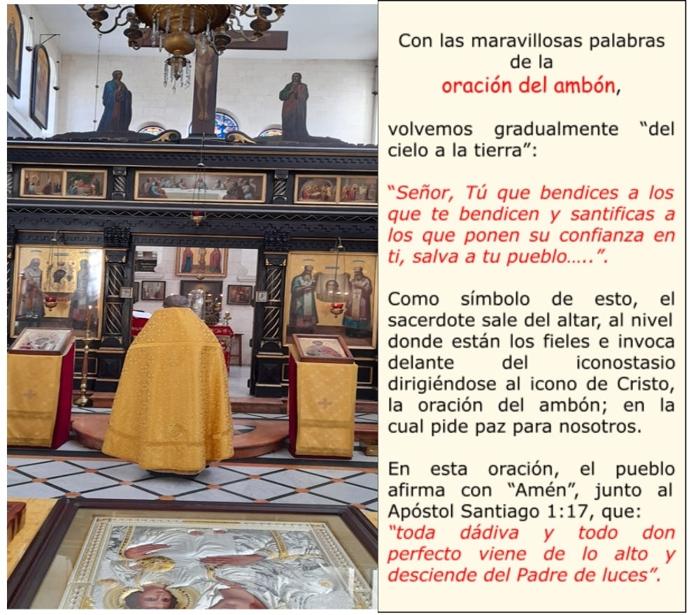 Te damos gracias, oh Soberano, que amas al hombre, que colmas nuestras almas de bienes, por habernos hecho dignos, hay también, de Tus celestes e inmortales Misterios. Ponnos a todos en el camino recto, afiánzanos en tu temor, vela sobre nuestra vida, da firmeza a nuestros pasos, por las oraciones y las súplicas de la gloriosa Madre de Dios y siempre Virgen, María, y de todos los Santos.