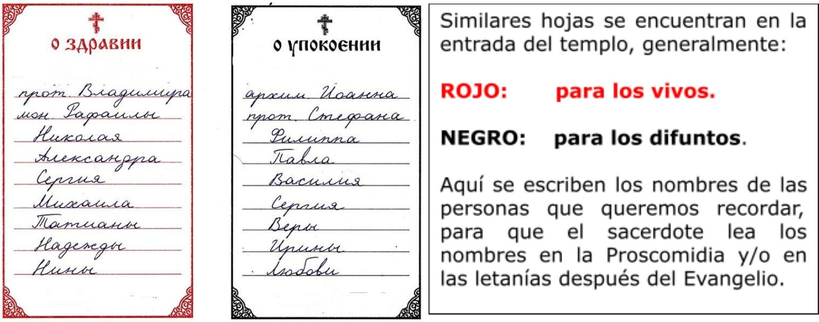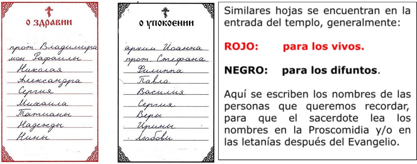 Las siguientes letanías ruegan por nuestros queridos difuntos, ya que también forman parte de la iglesia. Se recuerdan igualmente nombrándoles según la lista de “DIFUNTOS”, que escribimos y se entregamos en el altar antes de empezar el Oficio de la Santa Liturgia.