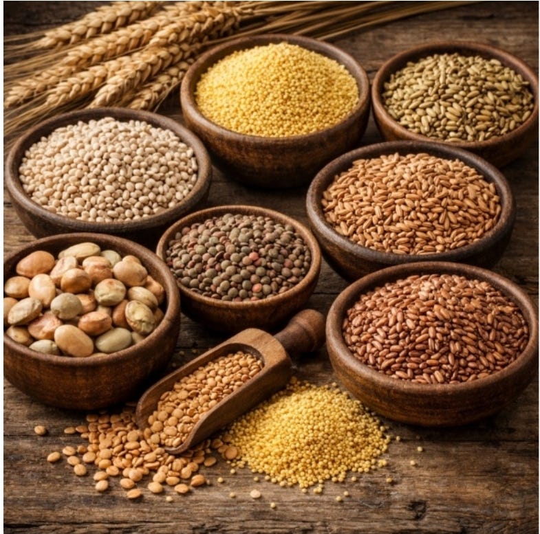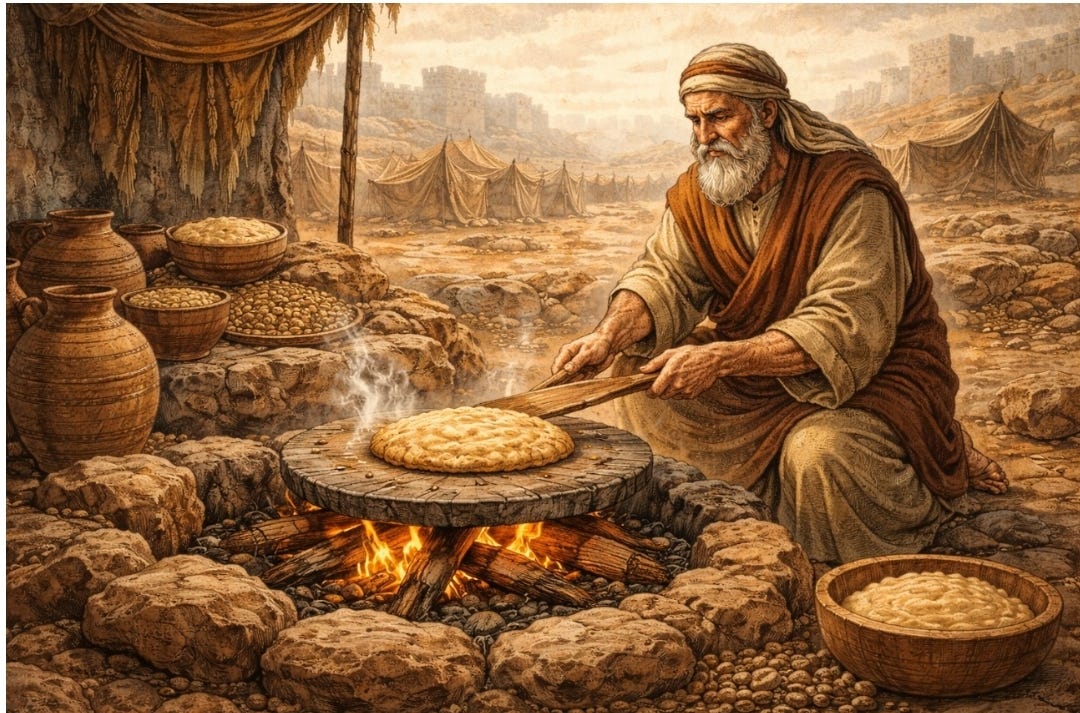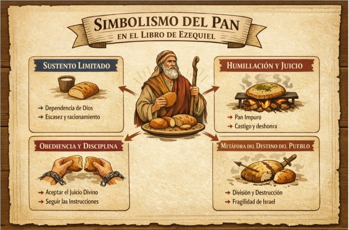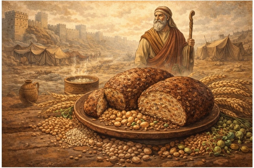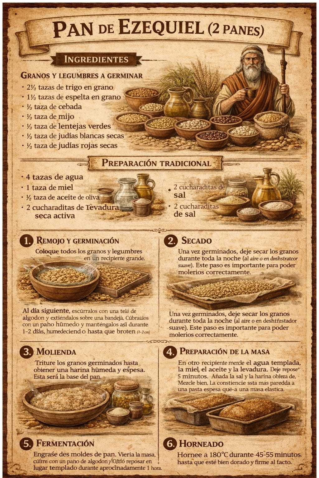 En Ezequiel 4:9 se menciona la receta dictada por Dios al profeta, que incluye seis semillas específicas: trigo, cebada, habas, lentejas, mijo y espelta, que se germinan antes de molerlas y hacer la masa.