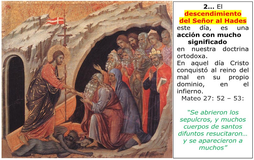 Cristo se anunció como Salvador para aquéllos que no tuvieron la suerte del anuncio antes de su Encarnación, trasladándolos a la Vida Eterna y destruyó el poder del diablo; para que su Resurrección se manifieste en toda su fuerza salvadora.